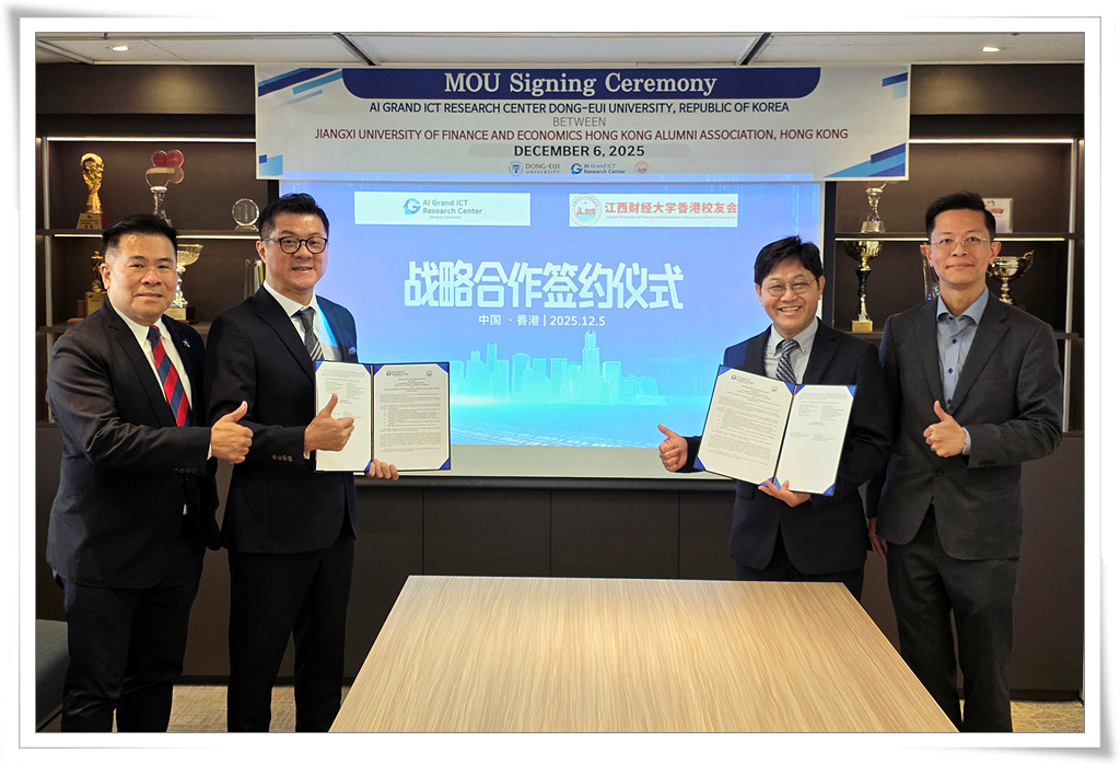 동의대학교 인공지능그랜드ICT연구센터(센터장 정석찬)는 12월 6일 중국 장시재경대학교 홍콩동문회와 국제 정보통신기술(ICT) 및 인공지능(AI) 분야 협력 강화를 위한 업무협약을 체결했다.